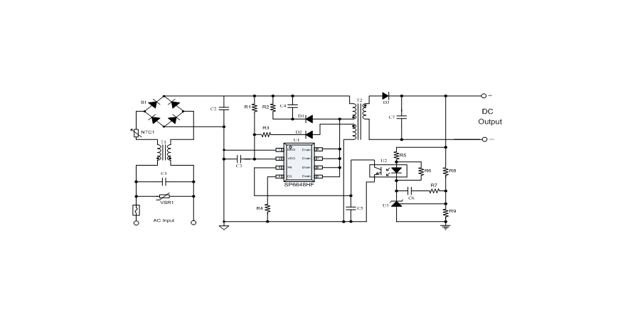 SP6648HF是一顆電流模式PWM控制芯片,內(nèi)置650V高壓功率MOSFET,應(yīng)用于功率在18W以?xún)?nèi)的方案。SP6648HF在PWM模式下工作于固定開(kāi)關(guān)頻率,這個(gè)頻率是由內(nèi)部精確設(shè)定。在空載或者輕載時(shí),工作頻率由IC內(nèi)部調(diào)整。芯片可以工作在綠色模式,以此來(lái)減小輕載時(shí)的損耗,提高整機(jī)的工作效率。SP6648HF在啟動(dòng)和工作時(shí)只需要很小的電流,可以在啟動(dòng)電路中使用一個(gè)很大的電阻,以此來(lái)進(jìn)一步減小待機(jī)時(shí)的功耗。芯片內(nèi)置有斜坡補(bǔ)償電路,當(dāng)電路工作于大占空比時(shí),避免次諧波振蕩的發(fā)生,改善系統(tǒng)的穩(wěn)定性。內(nèi)置有前沿消隱時(shí)(Leading-edge blanking time),消除緩沖網(wǎng)絡(luò)中的二極管反向恢復(fù)電流對(duì)電路的影響。SP6648HF采用了抖頻技術(shù),能夠有效改善系統(tǒng)的EMI性能。系統(tǒng)的跳頻頻率設(shè)置在音頻(22KHz)以上,在工作時(shí)可以避免系統(tǒng)產(chǎn)生噪音。SP6648HF內(nèi)置多種保護(hù),包括逐周期限流保護(hù)(OCP),過(guò)載保護(hù)(OLP),過(guò)壓保護(hù)(VDD OVP),VDD過(guò)壓箝位,欠壓保護(hù)(UVLO),過(guò)溫保護(hù)(OTP)等,通過(guò)內(nèi)部的圖騰柱驅(qū)動(dòng)結(jié)構(gòu)可以更好的改善系統(tǒng)的EMI特性和開(kāi)關(guān)的軟啟動(dòng)控制。