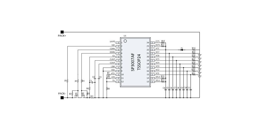 SP3007AF是一款用于6-7串鋰電池的保護芯片,SP3007AF 內(nèi)部集成了高精度的電壓、電流檢測電路,能夠?qū)崿F(xiàn)每串電池的過壓、欠壓保護,以及整串電池的充電過流、放電過流、短路保護和充放電的溫度保護等。SP3007AF 內(nèi)部集成 N型 MOSFET 的驅(qū)動電路,能夠直接驅(qū)動外部 N 型充電管和放電管,既可以兼容充放電分口應(yīng)用,也可以兼容充放電同口應(yīng)用。