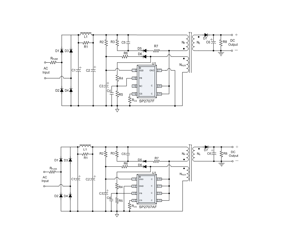 SP2707F非常適合低成本應(yīng)用方案,內(nèi)置環(huán)路補(bǔ)償,無需外置補(bǔ)償電容;采用原邊反饋控制,無需光耦和TL431。
