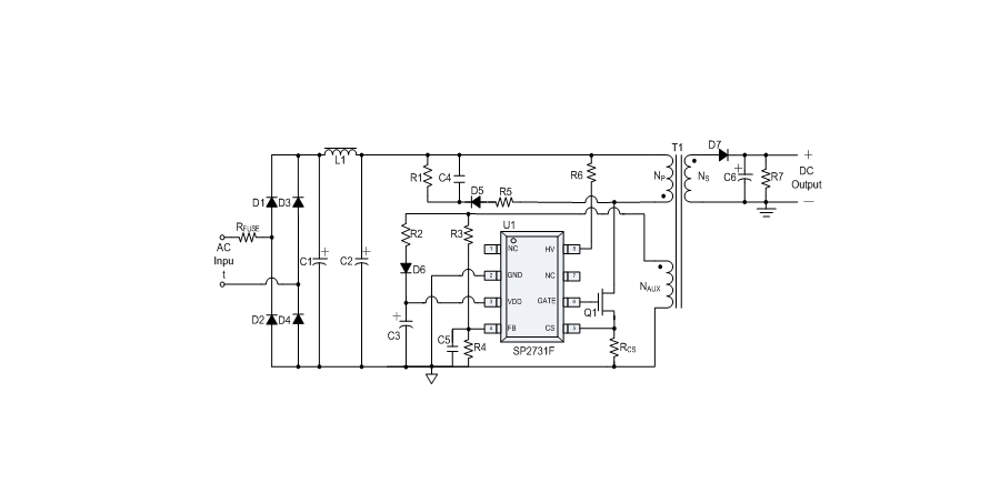 SP2731F是一款性能優(yōu)異的原邊反饋控制電路,應(yīng)用于中、小功率AC/DC充電器與適配器。控制電路使用原邊采樣技術(shù)進(jìn)行精確的恒流、恒壓控制,可以省去一般應(yīng)用中的光耦與TL431。